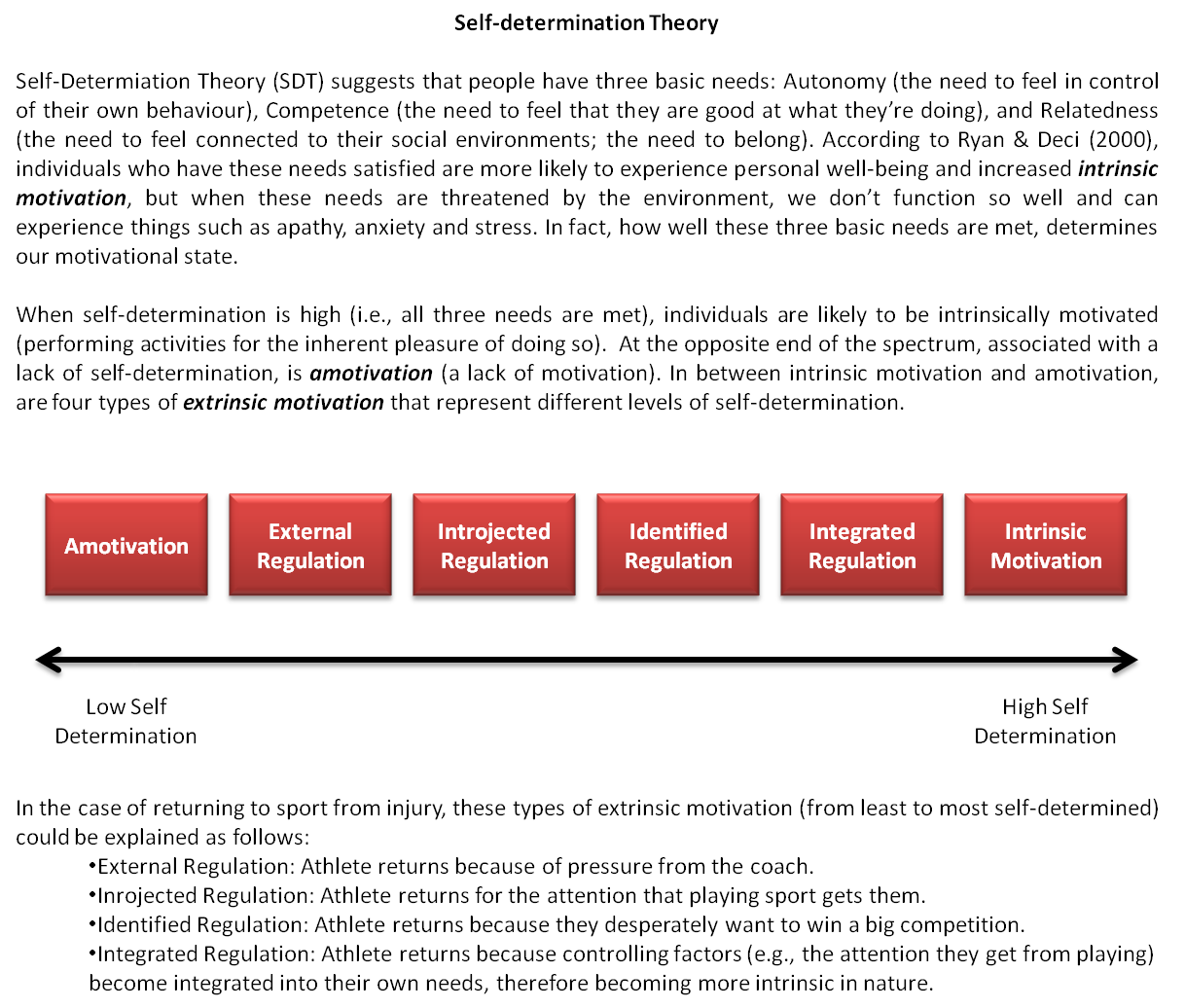 Sure enough, Podlog and Eklund found that athletes returning to sport primarily due to pressure from outside sources (external regulation), experienced more negative psychological outcomes, such as greater fear of re-injury, reduced confidence, and increased anxiety about their athletic performance.